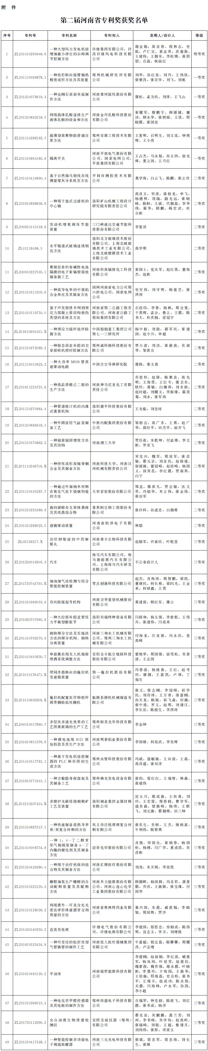 各省辖市人民政府、济源示范区管委会、各省直管县(市)人民政府,省人民政府各部门: 为深入贯彻习近平新时代中国特色社会主义思想,全面落实党的十九大和十九届二中、三中、四中全会精神以及习近平总书记视察河南重要讲话精神,加快知识产权强省建设,营造良好营商环境,推动经济社会高质量发展,根据《河南省专利奖励办法》规定,经省政府常务会议审议,决定授予“一种大型风力发电机组增加最小净空的尖峰调节控制方法”1项专利河南省专利奖特等奖,授予“一种齿形转向摇臂轴热精密成形方法及其装置”等5项专利河南省专利奖一等奖,授予“基于自然伽马射线在线测量煤灰分系统及方法”等18项专利河南省专利奖二等奖,授予“治疗抑郁症的中药解郁丸”等25项专利河南省专利奖三等奖。 希望获奖单位和个人珍惜荣誉,再接再厉,再创佳绩。全省各有关单位、广大知识产权工作者要以受表彰的单位和个人为榜样,锐意进取、开拓创新,不断提升知识产权创造、运用、保护和管理能力,为建设知识产权强省、谱写新时代中原更加出彩的绚丽篇章作出新的更大贡献。